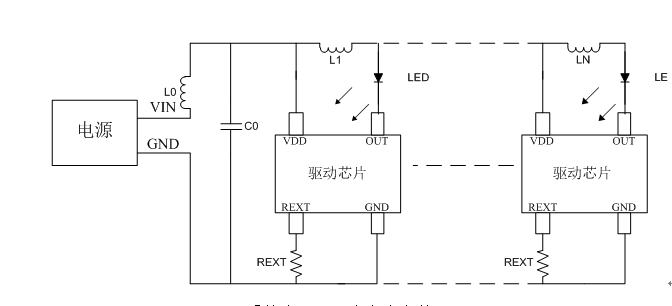 系统电源VIN上电时,OUT端口电压下降超过LED灯电压降后,OUT端口开始输出电流,寄生电感L0~LN上的电流发生变化,因此系统电源走线上的电压出现纹波。