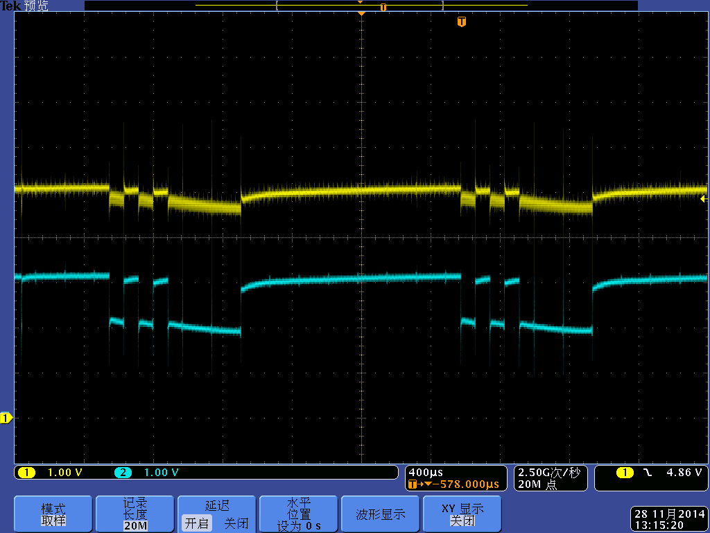 从振荡波形可知,LED灯的负极一直在电压差为2V,频率20MHz左右的类正弦波下工作。较大的电源尖峰、瞬态大电流、持续极高频的开关会降低LED灯的使用寿命。
